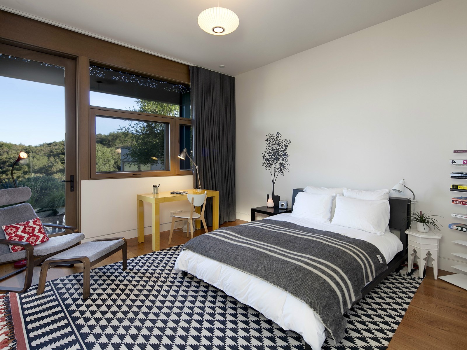 With the solid white walls and the decoration giving more simplicity to the room, a colorful rainbow rug with marble patterns would just add the final touch to the look.