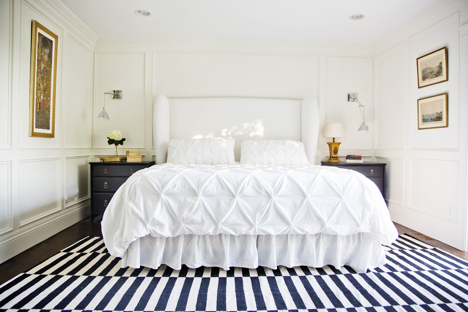A second way is placing 2/3 of the bed only on the rug. This will frame the bed leaving the night stands directly on the floor while still allowing 24-30 inches free.