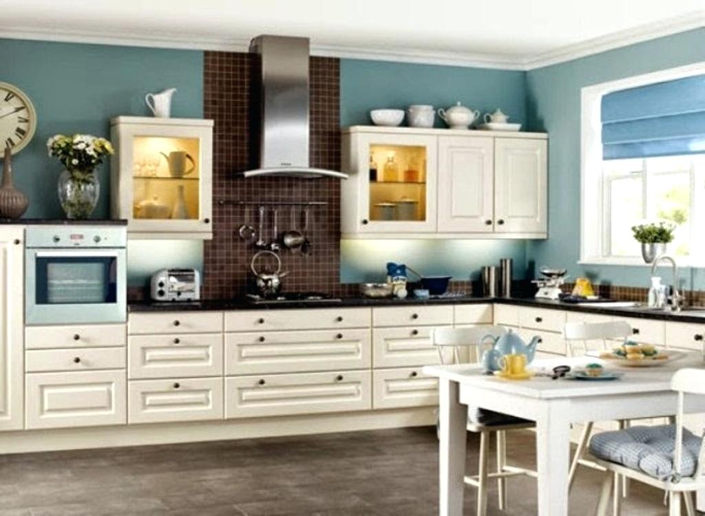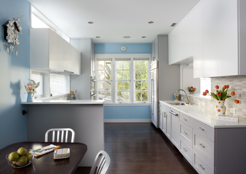To create a spectacular atmosphere in the interior of the kitchen with blue kitchen walls use white cabinets. The top and the lower kitchen cabinets could be white it will increase the visual space or you can use white cabinets only in the lower part with open shelves in the top.
