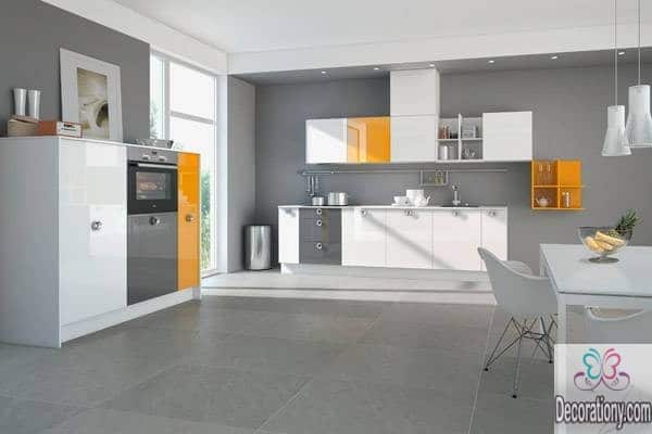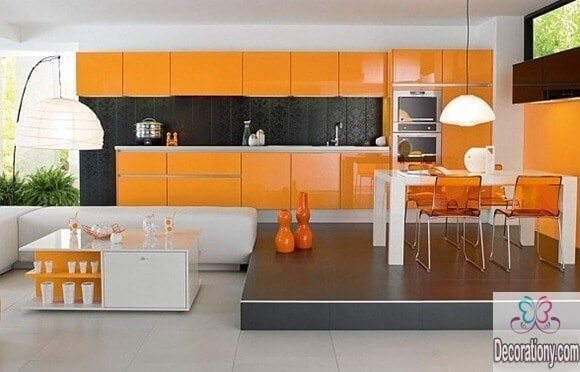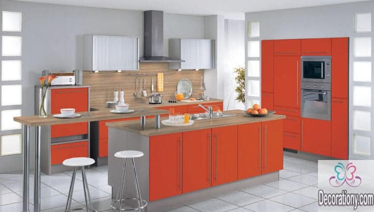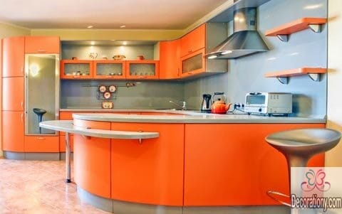Orange kitchen cabinets color is the new 2018 trend. You can mix orange with some gray in different places to add an attractive and colorful appearance to your modern kitchen design. This way you will have a colorful kitchen filled with texture while some gray paintings break the brightness a bit.