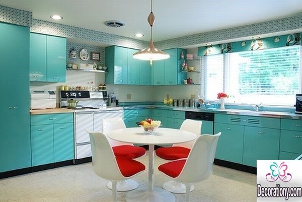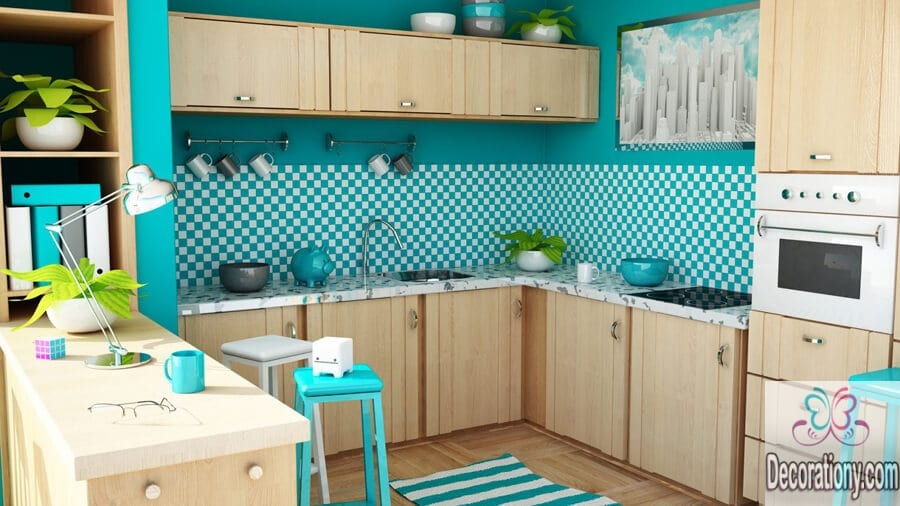For a stylish and contemporary look, mix the chic turquoise with white. Personally, I add a lot of cheerful colors to my white kitchen. Since I always loved how turquoise influences my kitchen with texture and cheerful spirit. It shows your personality, use the colors you love and do not limit yourself. You can also take a look at these colorful kitchen backsplash ideas here and mix it with a bright color!