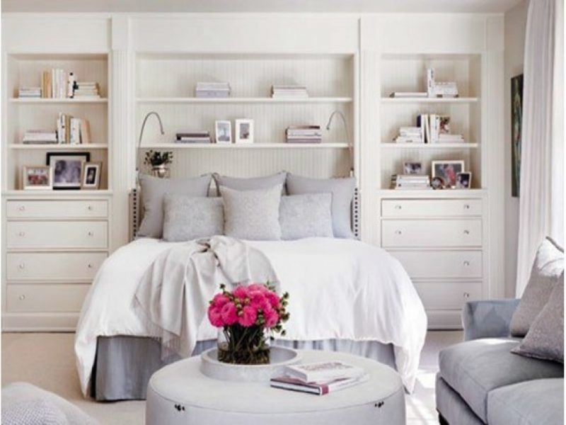 The optimal quantity of shelves above the bed is only one to two shelves. Most of the time it is only one shelf above the bed, but if you have two built-in shelves above the bed, then it is possible to split the decorations between them. The bottom one could be used for lighting and the top could be used to add decorative items or to be used as a bookshelf.