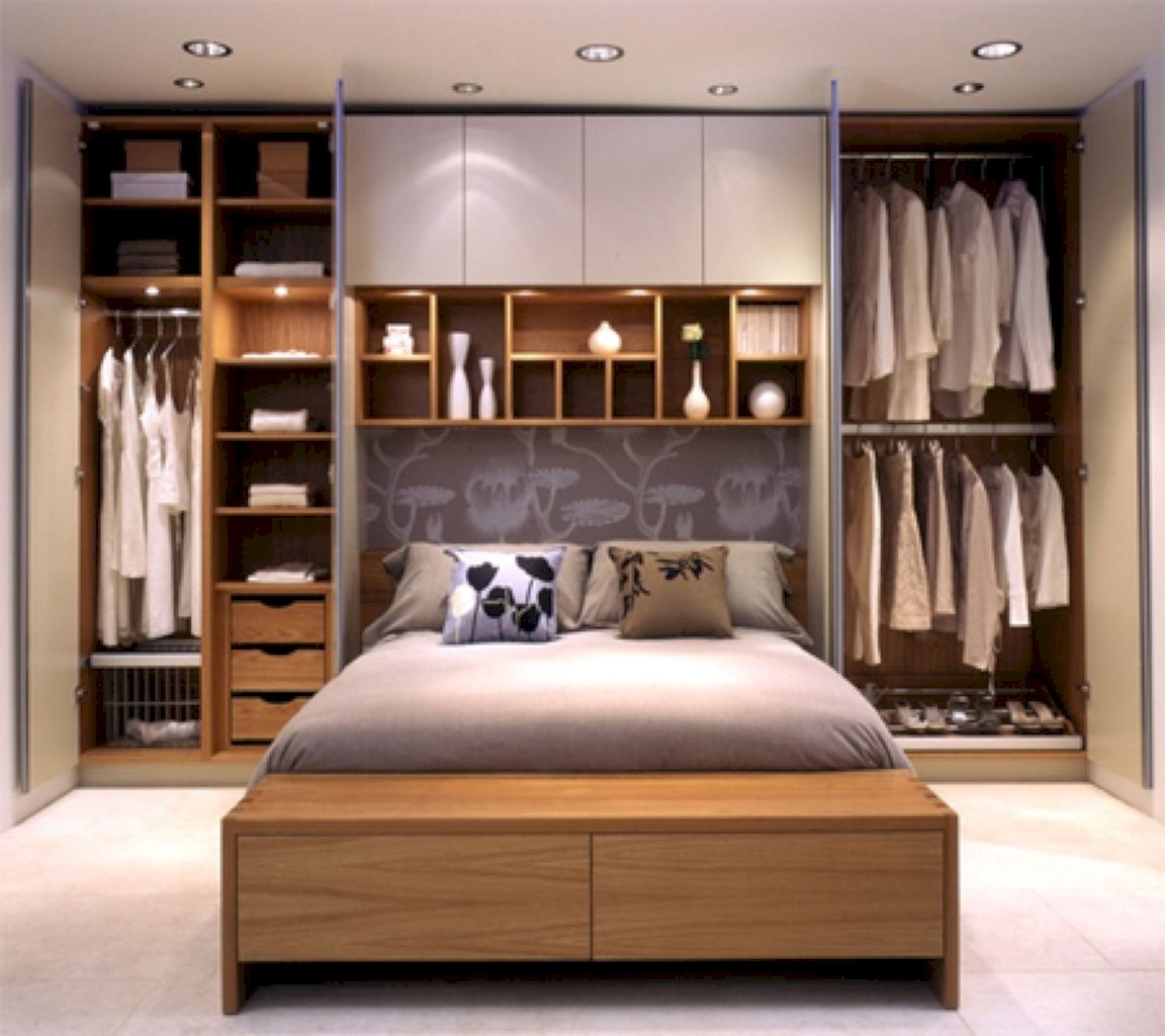 We talked a lot about master bedrooms with built-in shelving above the bed and it is the time for the amazing option which is the walk-in closet. If you were lucky enough to have a sunken wall between two columns that could be used to install built-in shelves which can consist of two parts, divided vertically or horizontally with a mirror in the middle and close this place with a sliding door or even with a curtain, you can easily name it a walk-in closet. It is a simple way to use built-in shelving smartly and leave the old idea of the ordinary closet and have more space in your master bedrooms with built-in shelving.