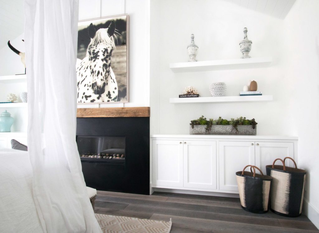 As for the colors, they also have the opportunity to make a bright emphasis on the interior of the master bedroom. The most popular color used with the shelves above the bed is white. White color refreshes the interior, looks simple and concise, and most importantly it fits almost every decoration. The white is neutral and goes with almost all the colors.