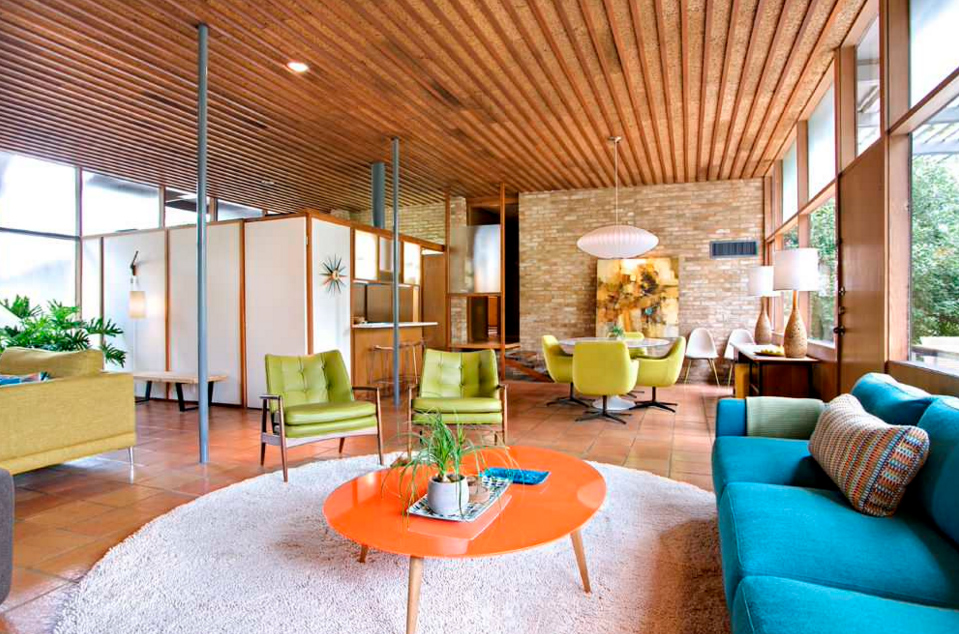 The colors of the mid-century style go from neutrals to bold… A lot of black and white. Giving special interest in geometric patterns and animal skin carpets.