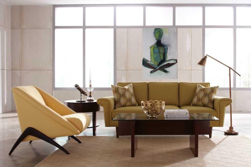 Eero Saarinen designed his classic marble top table in 1956. He eliminated any extra parts including the extensive table legs. And until 2018, the simple lines and marble topping still look modern and fresh. A simple answer for what makes mid-century living room design timeless.