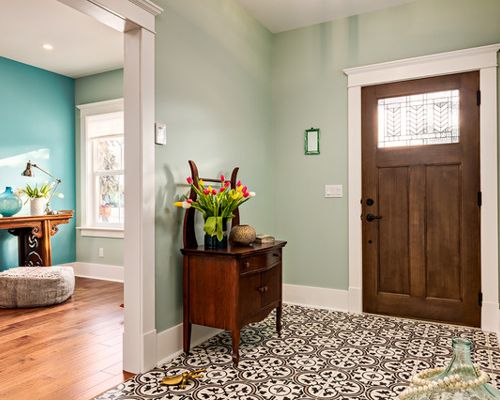 a simple piece of decoration could be a piece of furniture or textile, a large potted plant or wall decor with colorful pictures, family photos in a brilliant frame will make your foyer looks great.