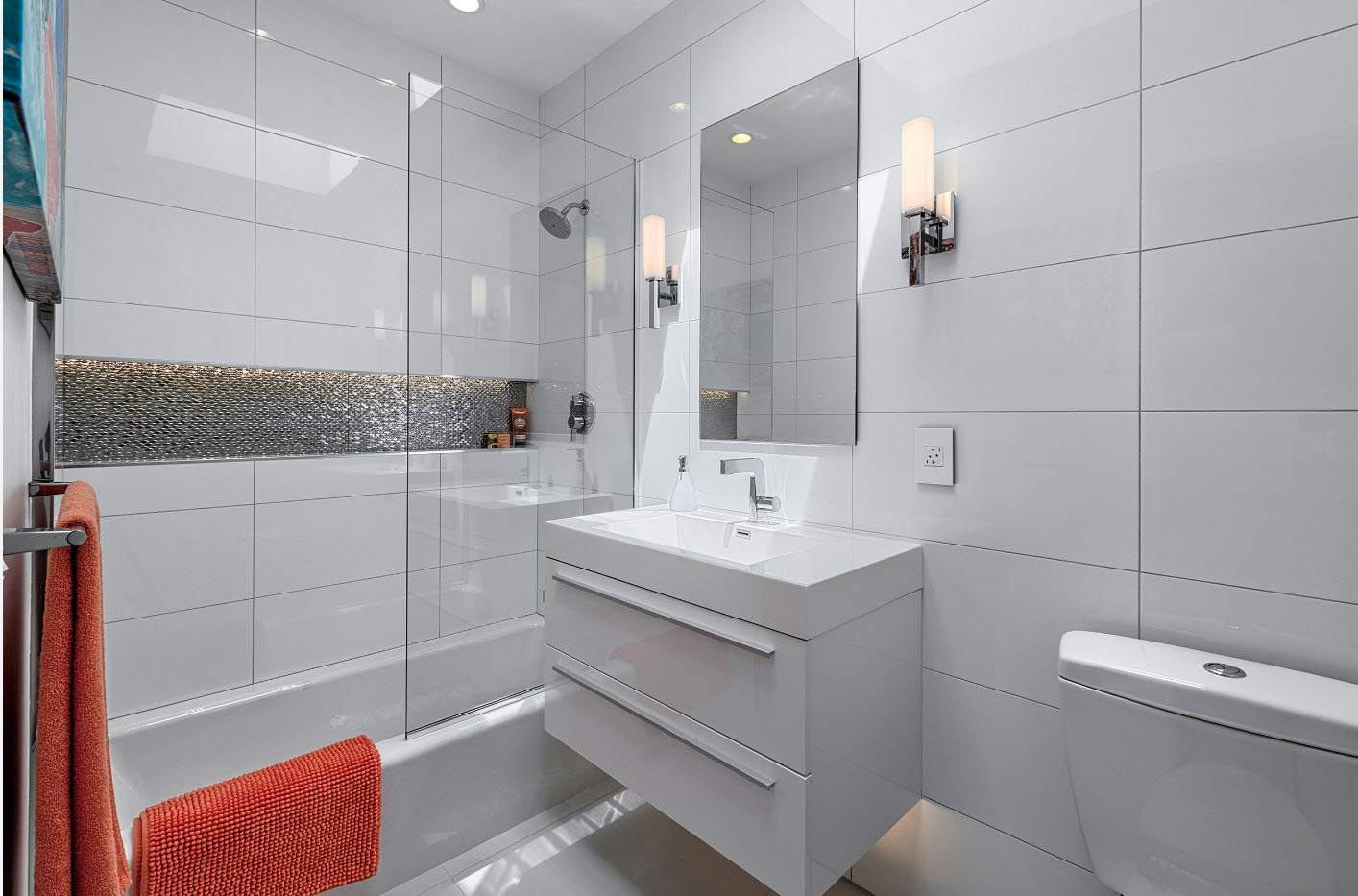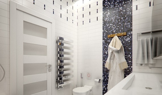 The design of the white bathroom can also be made exciting and modern with white tiles with mosaic tiles in different shades of white.